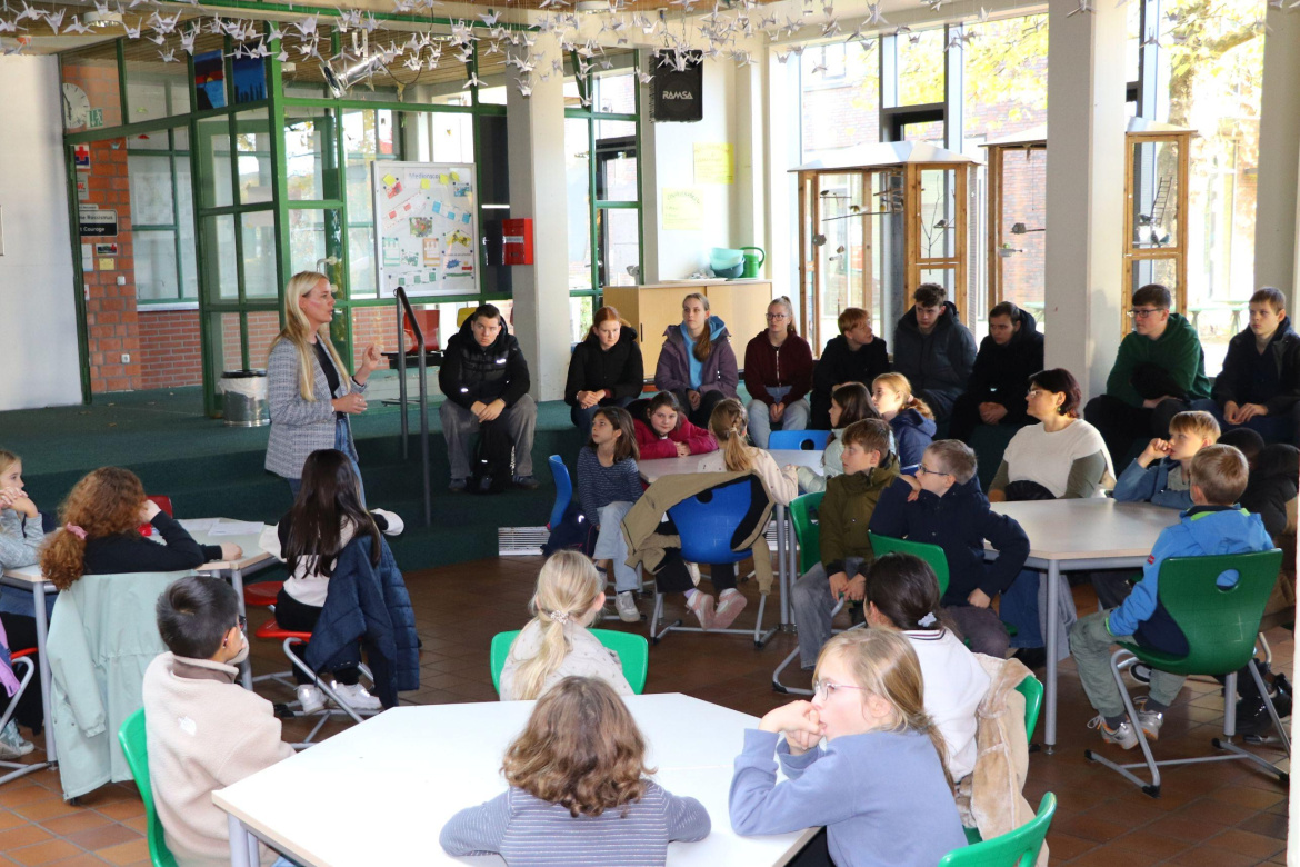 Im Anschluss dürfen die Viertklässler am Unterricht der Klassen 5-7 teilnehmen, etwa am Sportunterricht der Kl. 5b mit Lehrer Jan Küsters oder am Religionsunterricht der Kl. 6a mit Lehrerin Esther Cantama. Auch die begleitenden Lehrerinnen der Astrid-Lindgren-Grundschule, Frau Burg und Frau Voss, nutzen die Gelegenheit, um den Unterricht zu beobachten. Maike Stahl, Abteilungsleiterin für die Jahrgänge 5 bis 7, informiert sie zusätzlich über das pädagogische Konzept der Schule. Sie betont: „Wir freuen uns sehr über den Besuch der Grundschulen. Unser Ziel ist es, den Übergang zur weiterführenden Schule für die Kinder so angenehm wie möglich zu gestalten. Durch die Hospitation erhalten sie einen ersten Eindruck von ihrer möglichen neuen Schule.“
